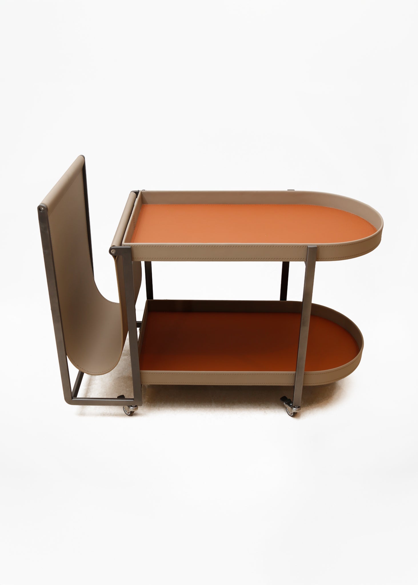 Carro auxiliar de diseño contemporáneo con doble bandeja en tonos cálidos y estructura metálica. Funcional y decorativo, ideal para servir o complementar tus espacios con estilo.