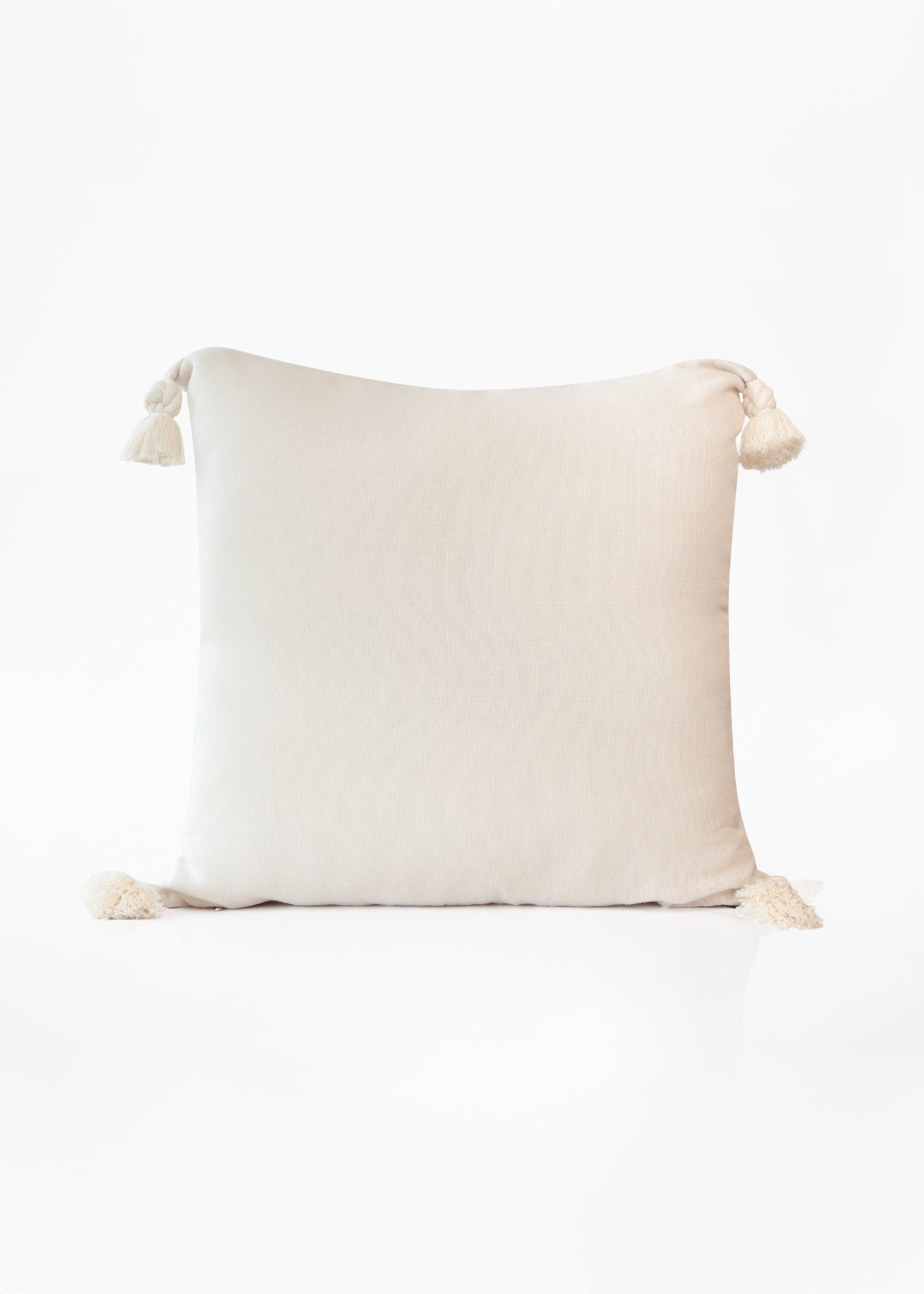 Cojín decorativo cuadrado en tono marfil, de apariencia suave y elegante, con borlas en las esquinas que añaden un toque artesanal y acogedor. Ideal para ambientes neutros y cálidos.