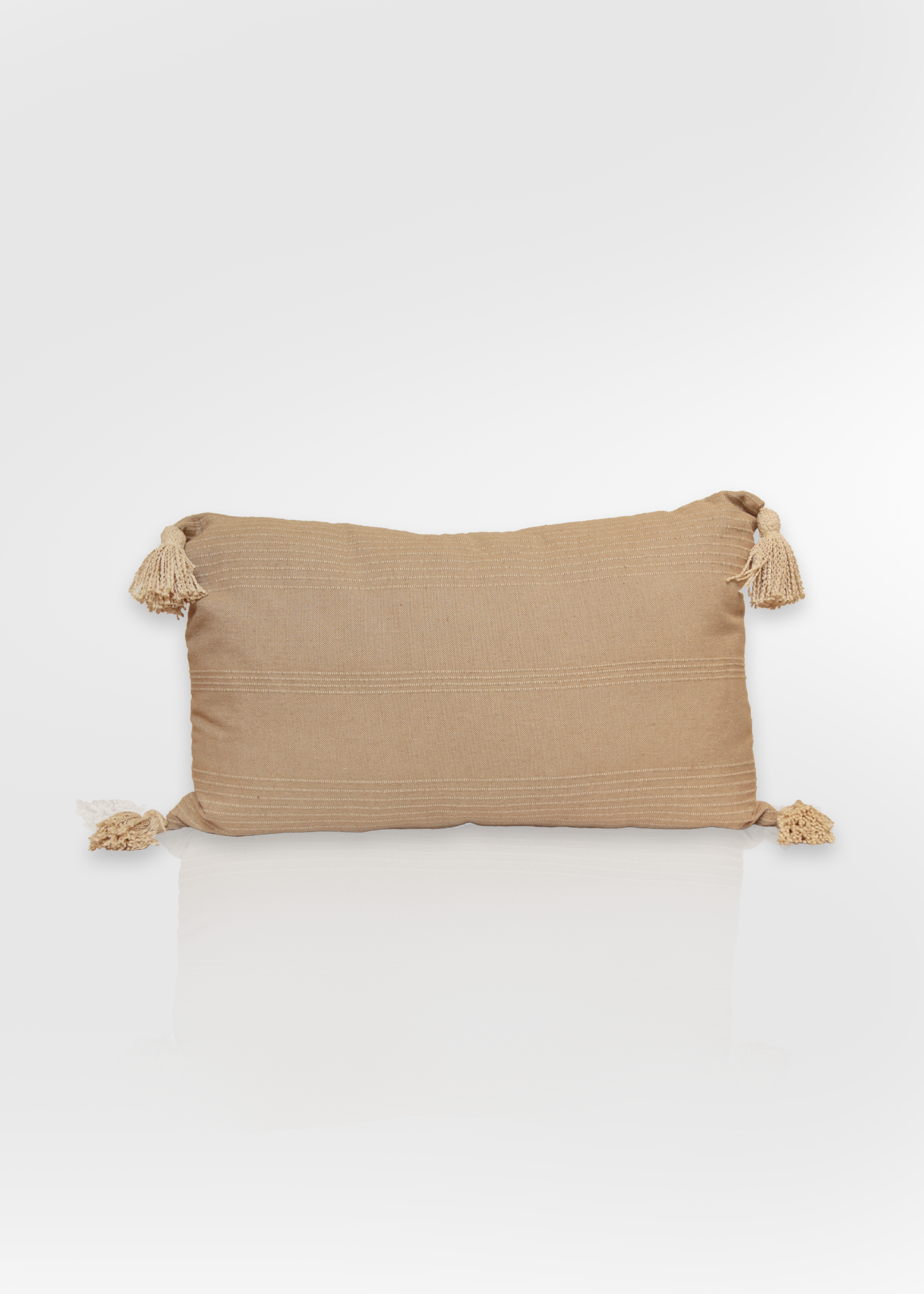 Cojín rectangular decorativo en tono beige claro con sutil textura de líneas. Cuenta con borlas en las esquinas que aportan un estilo artesanal y acogedor. Perfecto para complementar sofás o sillones en ambientes cálidos y neutros.