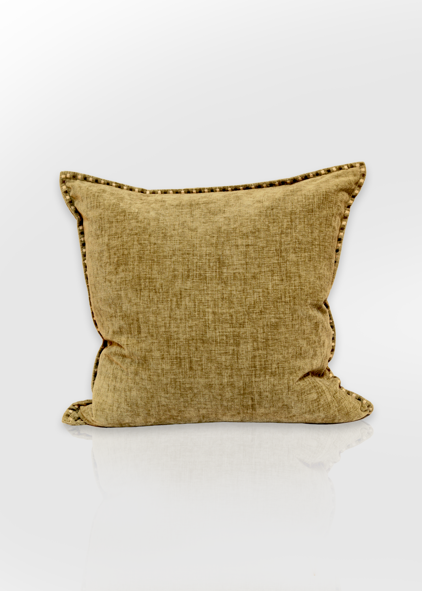 Cojín decorativo cuadrado en tono verde oliva con textura suave y borde decorativo con detalles en contraste. Perfecto para añadir un toque de color natural y elegante a cualquier espacio.