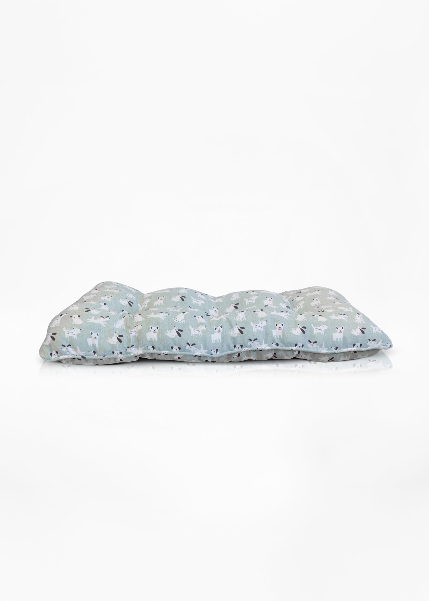 Cojín para perro con diseño estampado de perritos sobre fondo gris verdoso. Suave y acolchado, ideal para brindar comodidad en superficies planas como pisos o dentro de casas para mascotas. Perfecto para perros medianos que disfrutan descansar con espacio.