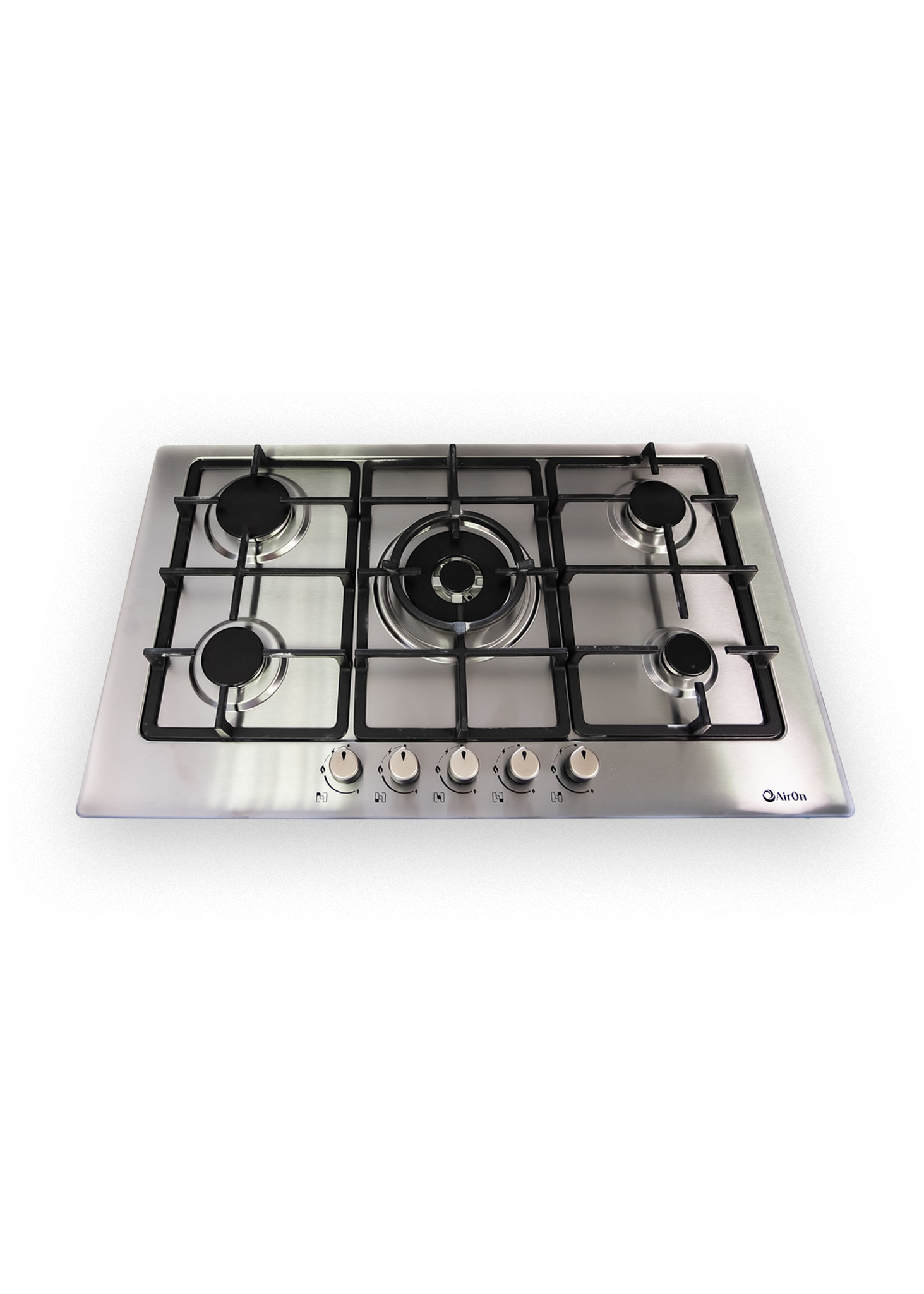 Cubierta a gas en acero inoxidable. 86 cm de ancho. Encendido electrónico en cada quemador. Comando frontal. 5 quemadores a gas: 1 Triple Corona (12.000 Btus), 1 Rápido (9.000 Btus), 2 Semi-rápidos (7.000 Btus), 1 Auxiliar (3.500 Btus). Parrillas de hierro fundido. Funcionamiento: 110 v / 60hz.
