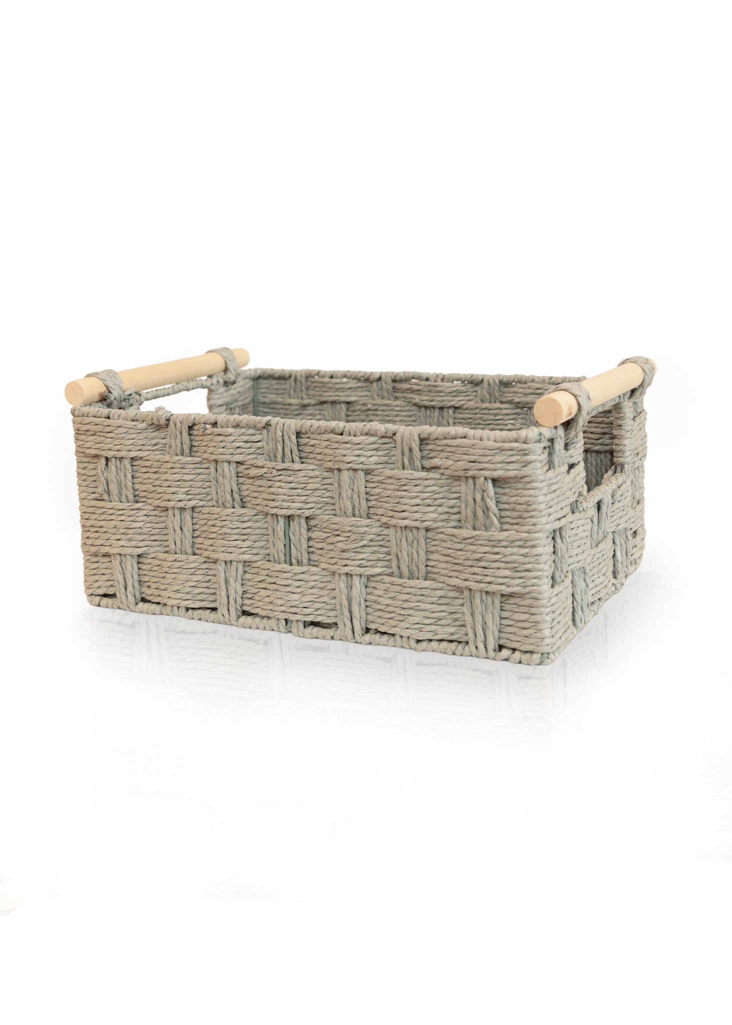 Canasta tejida color verde con asas de madera, estilo y funcionalidad en uno. Perfecta para organizar juguetes o accesorios de tu peludo con un toque natural.