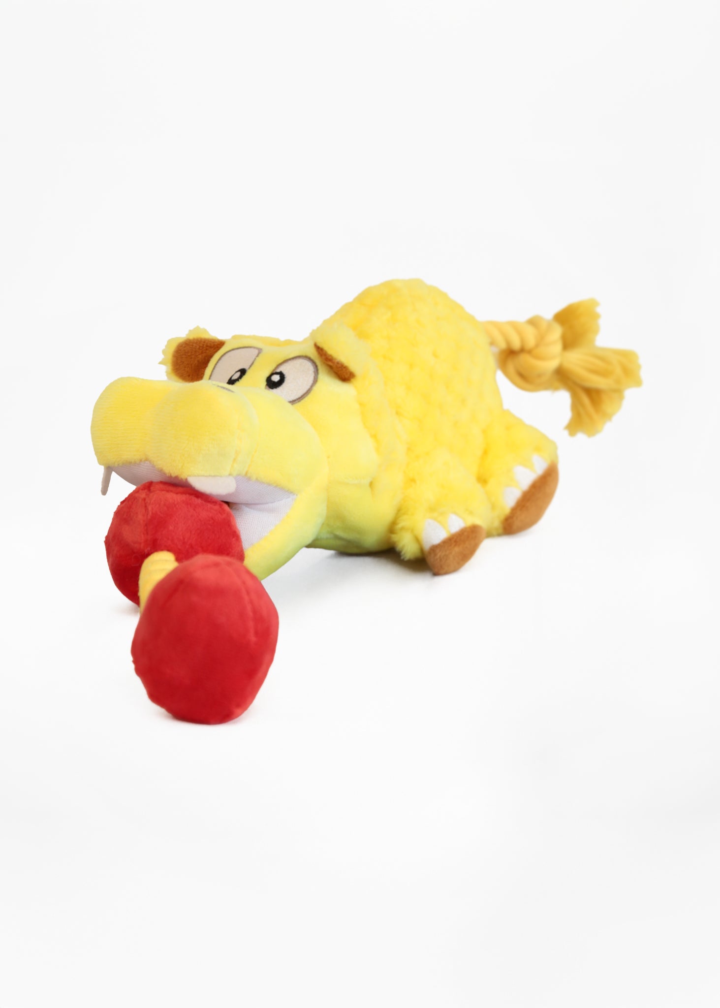 Juguete de peluche para perro con diseño de hipopótamo amarillo, incluye cuerda para tirar y sonido interno. Ideal para juegos interactivos y entretenimiento.