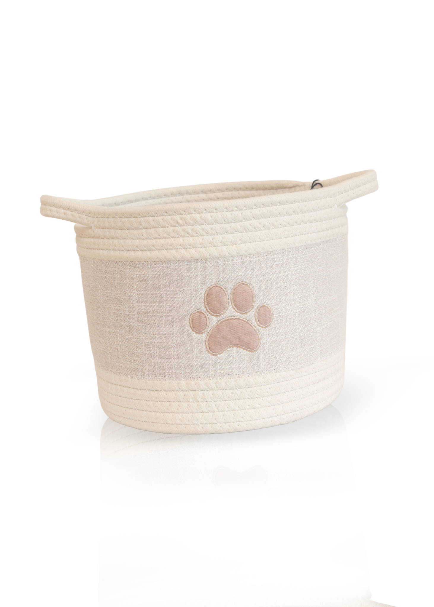 Canasto de Tela con Huella – Almacenamiento con Estilo. Este canasto en tono neutro, decorado con una huella de mascota, es ideal para organizar juguetes, mantas o accesorios de tu peludo. Su diseño tejido con asas lo hace práctico y decorativo, perfecto para cualquier rincón del hogar.