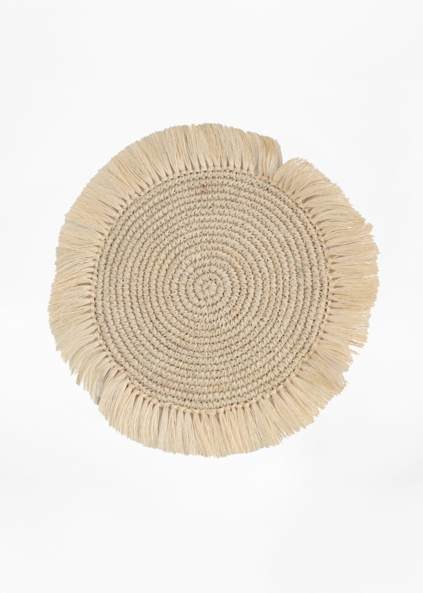 Individual redondo tejido a mano con fibras naturales y flecos decorativos. Perfecto para vestir tu mesa con un estilo rústico y elegante.