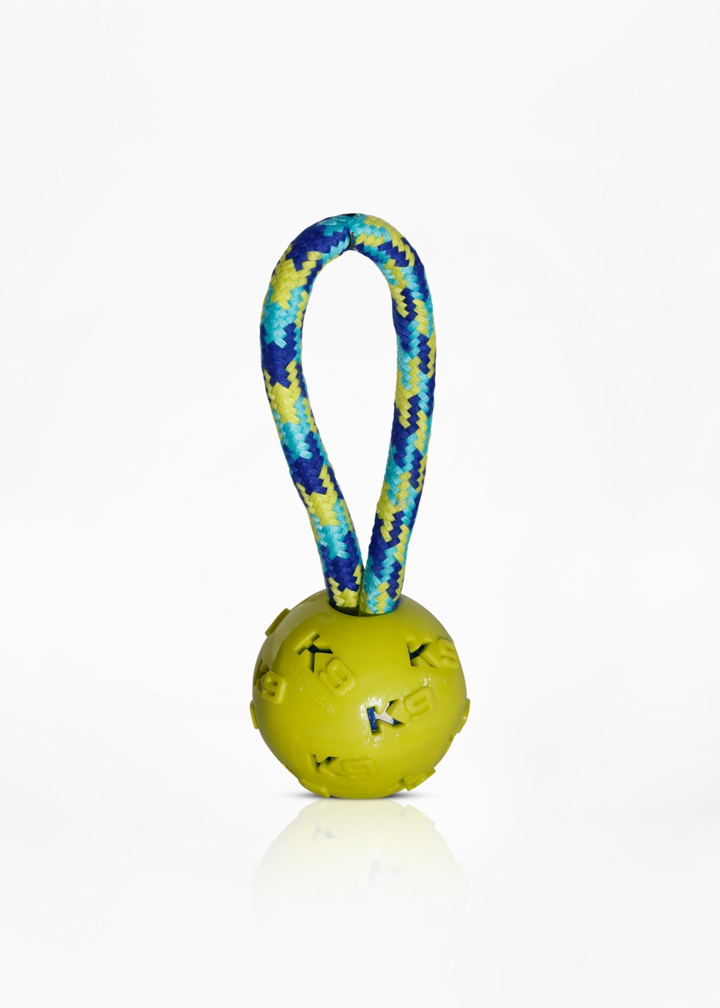 Juguete para perro con cuerda y pelota de goma resistente. Ideal para juegos de tirar y morder, diseñado para brindar diversión activa y duradera.