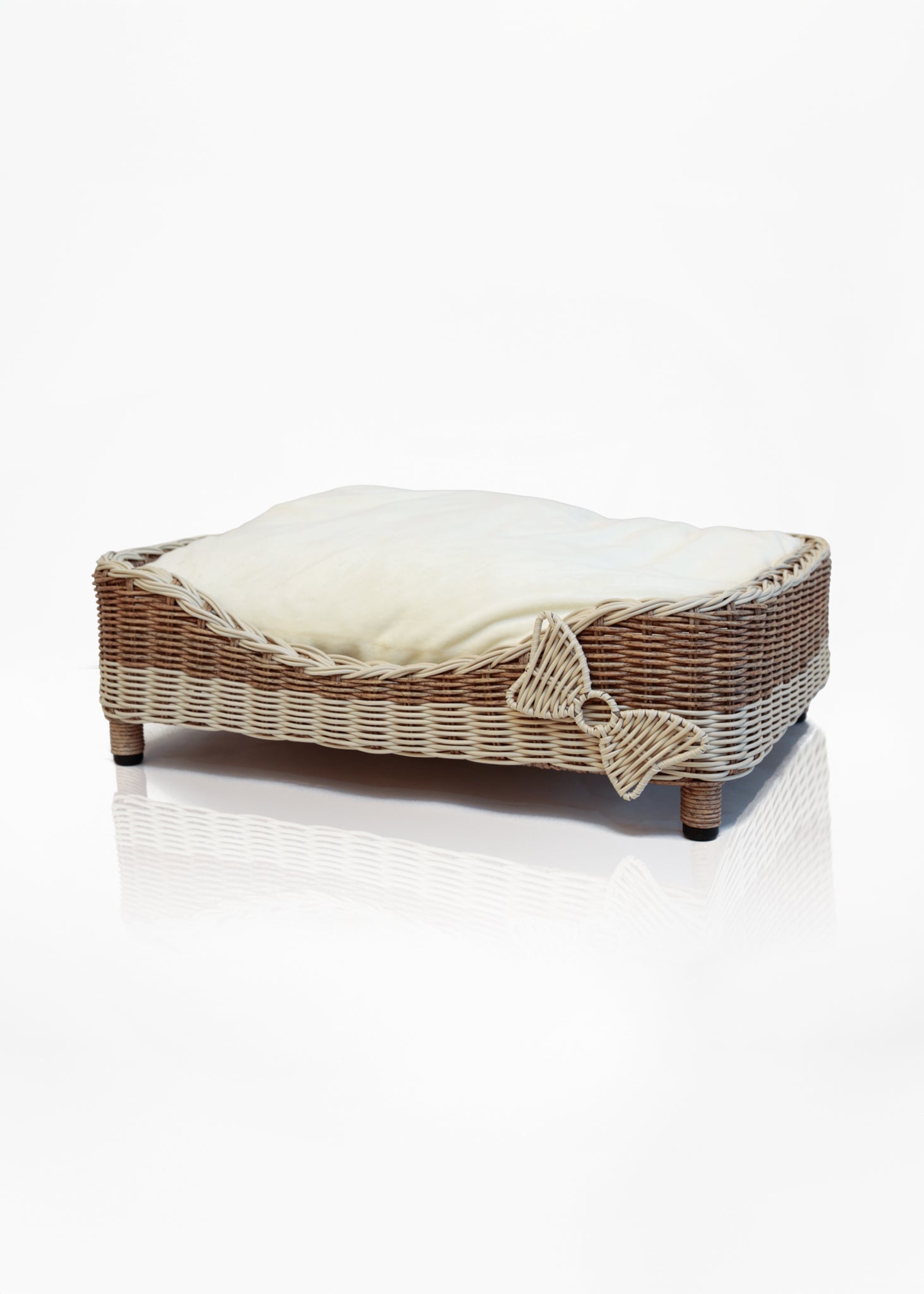 Cama para perro de mimbre en tonos naturales con cojín blanco. Su diseño elevado y decorativo con moño tejido la convierte en una opción elegante y ventilada, ideal para climas cálidos y espacios interiores con estilo rústico o natural. Aporta confort y buen gusto al descanso de tu mascota.