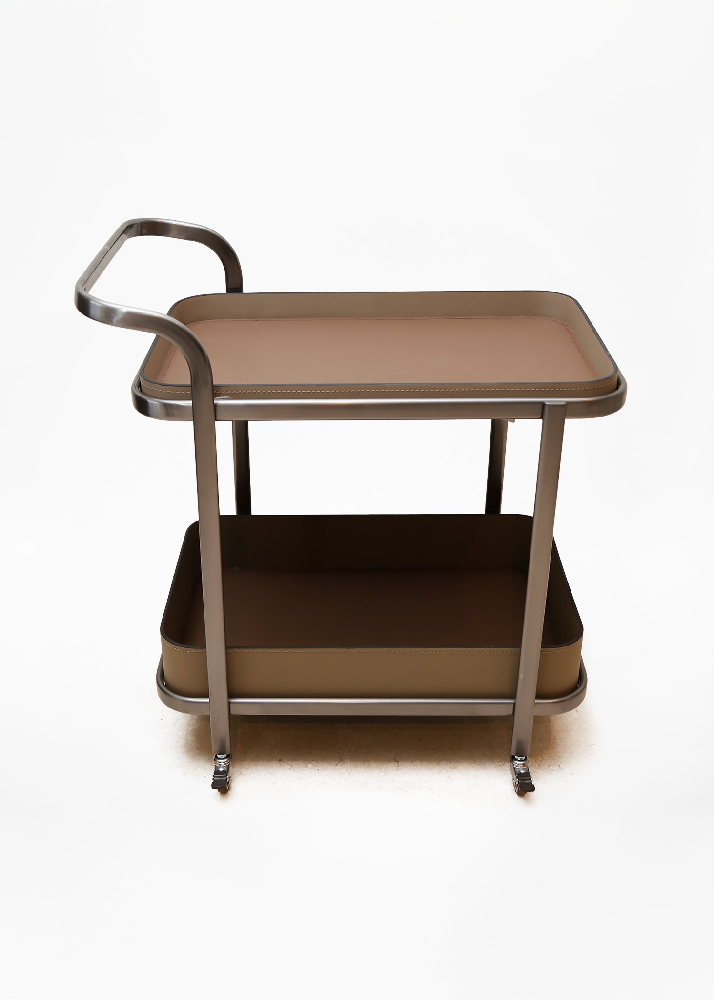 Mesa de bar auxiliar tapizada en cuero café y estructura en tubo de acero pintado, para licor o estación de café. Ideal para servir o decorar.