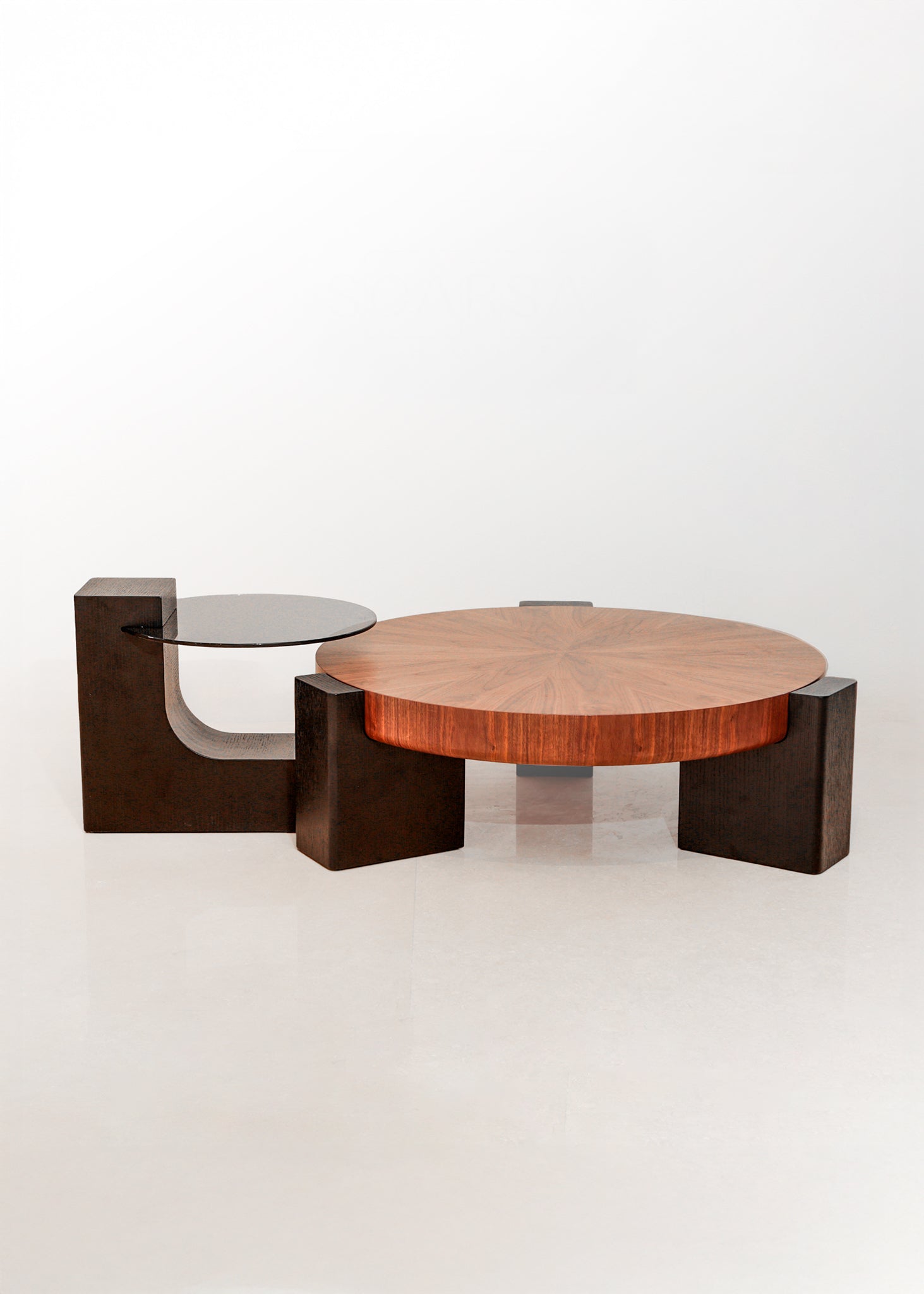 Mesa de centro con diseño contemporáneo y funcional. Su estructura presenta un espectacular tablero redondo en madera con vetas en patrón radial, que aporta calidez y elegancia al ambiente. Incluye una pieza lateral semicircular en cristal ahumado y base de madera, ideal como superficie auxiliar o elemento decorativo. Perfecta para complementar salas modernas con un toque de sofisticación.