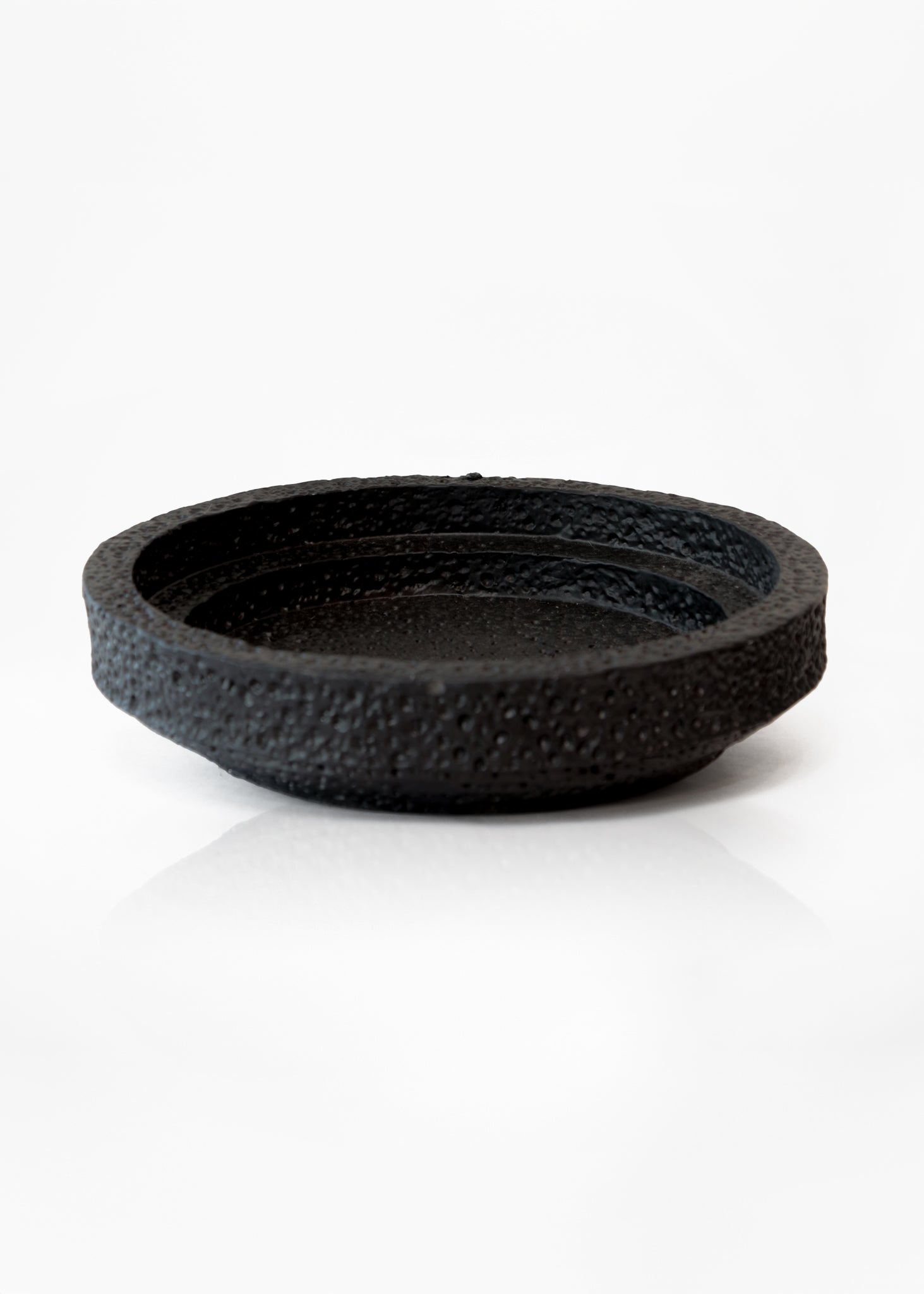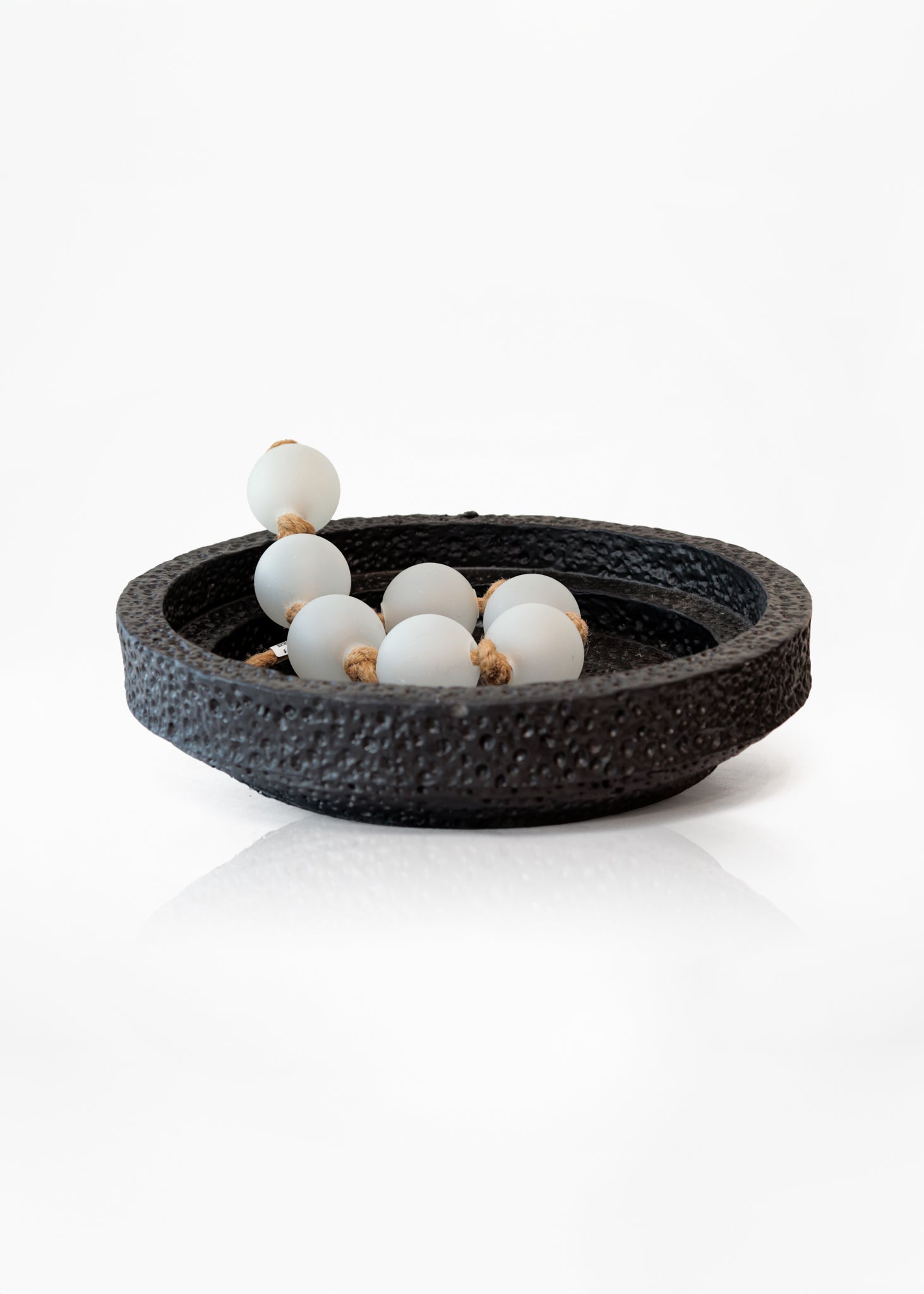 Bandeja decorativa de diseño contemporáneo en acabado negro texturizado, con un patrón orgánico que evoca formas naturales y artesanales. Elaborada con materiales resistentes, esta pieza es ideal para vestir mesas de centro, consolas o comedores con un toque sofisticado y moderno. Su presencia escultural convierte cualquier superficie en un punto focal elegante y audaz.